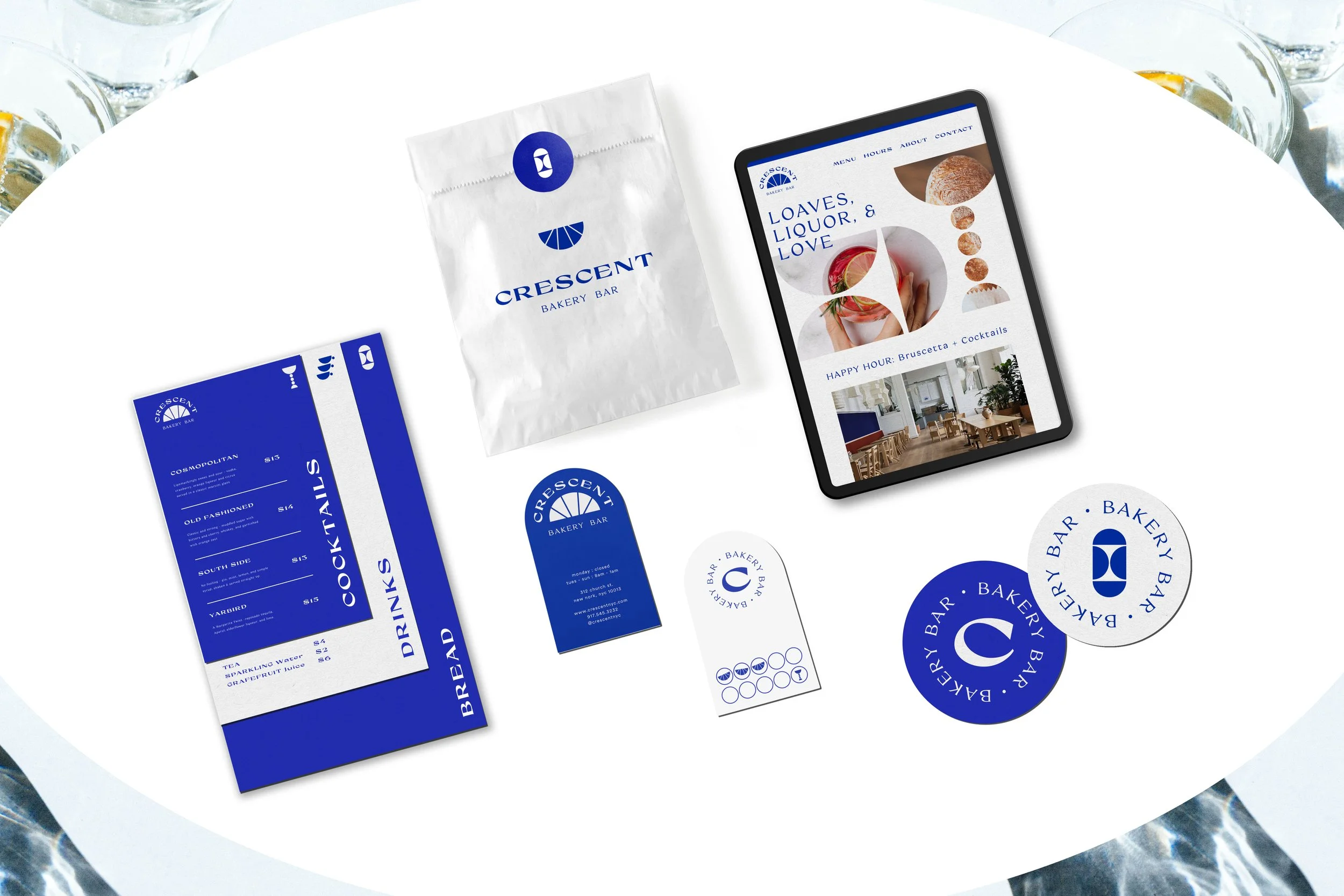 Bread and cocktails come together to create a social, relaxed atmosphere. The color French blue nods to the baguette inspiring the cool, minimalist, but bold brand system. Using only organic ingredients and artisan recipes, Crescent has a European vibe that reads quality without having to say it.